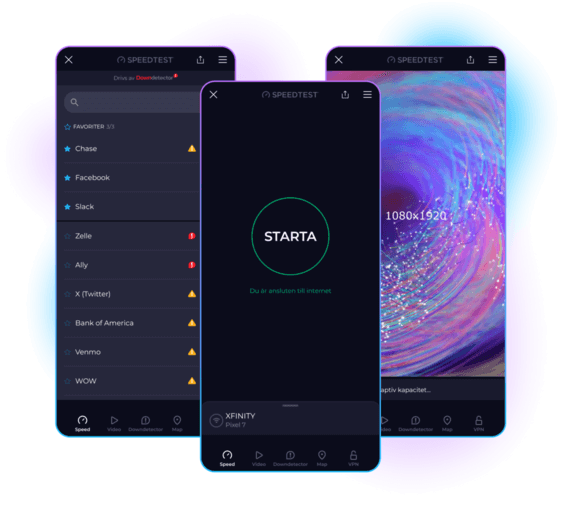 Skaffa den kostnadsfria appen Speedtest till din iPhone eller iPad för att testa din anslutningshastighet och kvalitet när som helst, var som helst. Ta reda på hur snabbt internet är var som helst i världen med hjälp av vårt stora globala servernätverk.